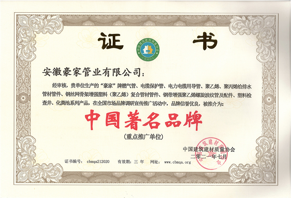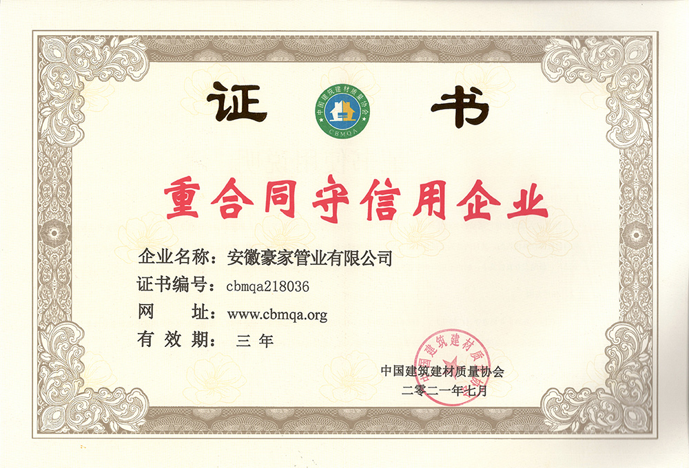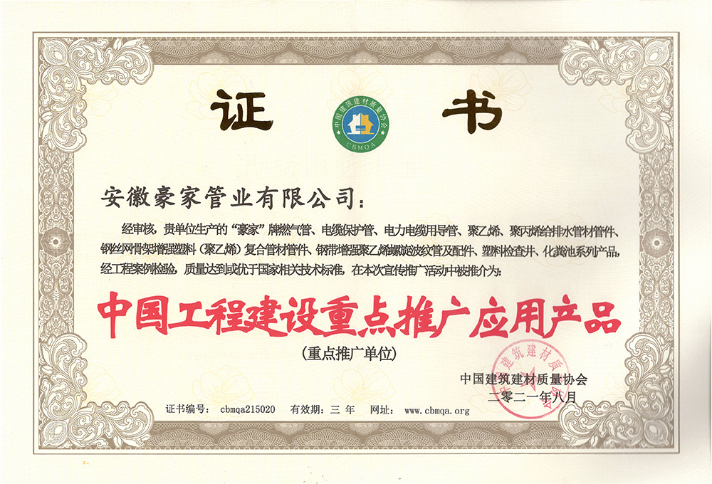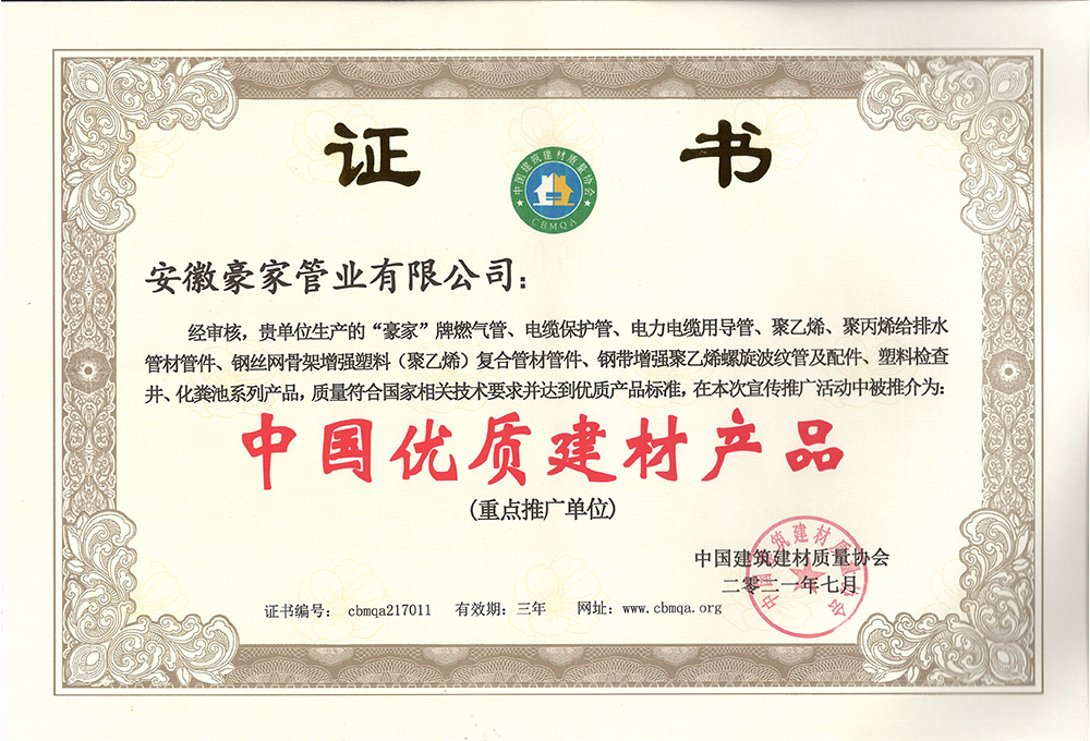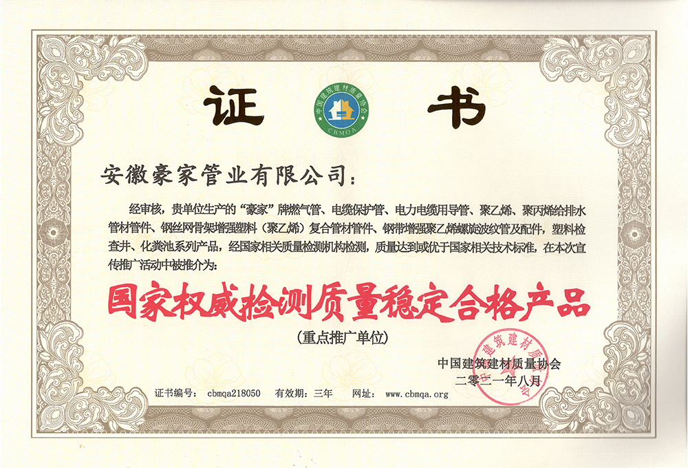 多年來(lái),豪家管業(yè)注重科技研發(fā),秉承“質(zhì)量求生存、信譽(yù)求發(fā)展”發(fā)展理念,產(chǎn)品通過(guò)國(guó)家的檢測(cè)機(jī)構(gòu)檢測(cè),技術(shù)指標(biāo)均高于相關(guān)標(biāo)準(zhǔn),多次參與編寫(xiě)相關(guān)國(guó)家標(biāo)準(zhǔn)、產(chǎn)品圖集、擁有多項(xiàng)發(fā)明和國(guó)家專利,受到行業(yè)和 市場(chǎng)的廣泛認(rèn)可,也斬獲眾多榮譽(yù)。